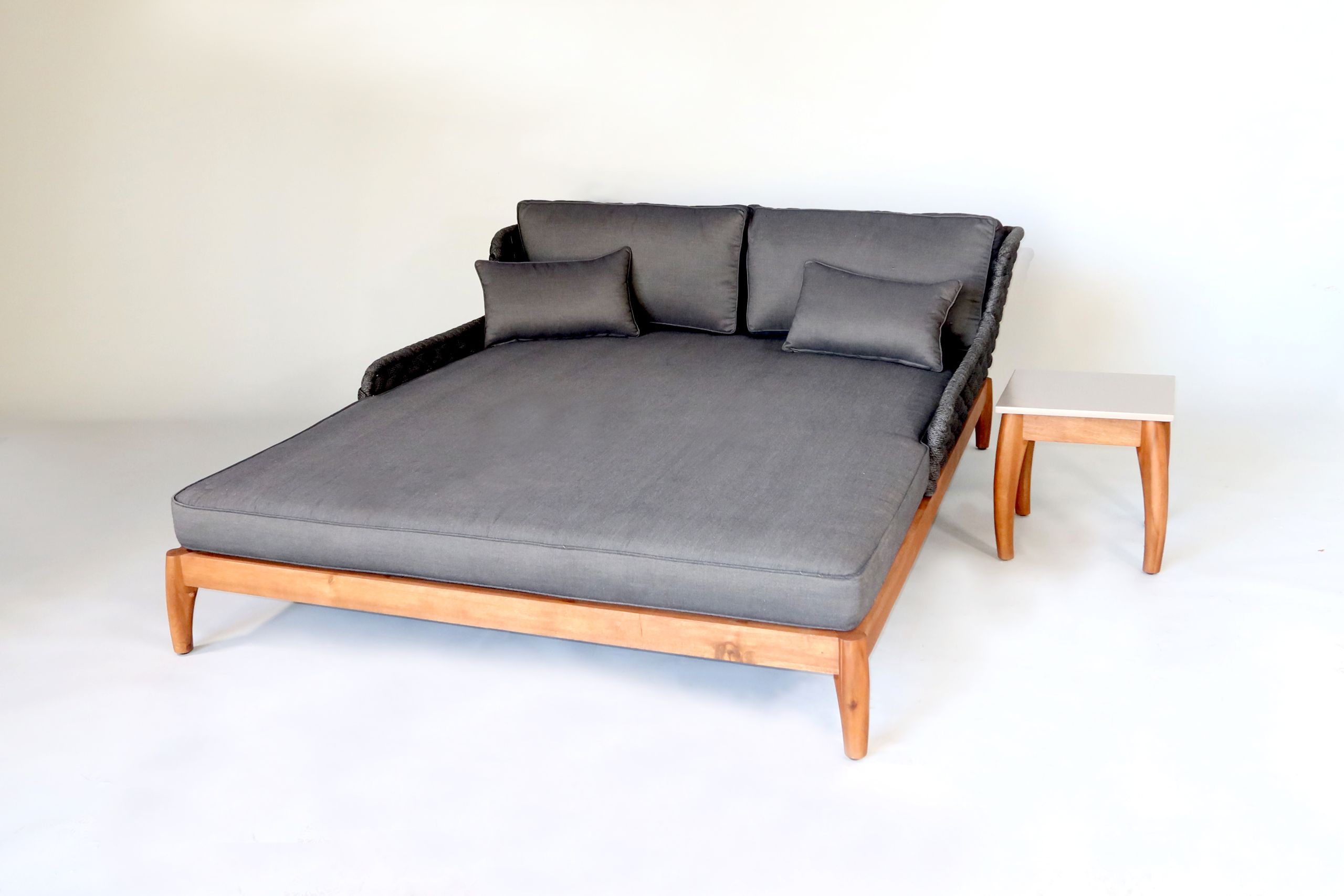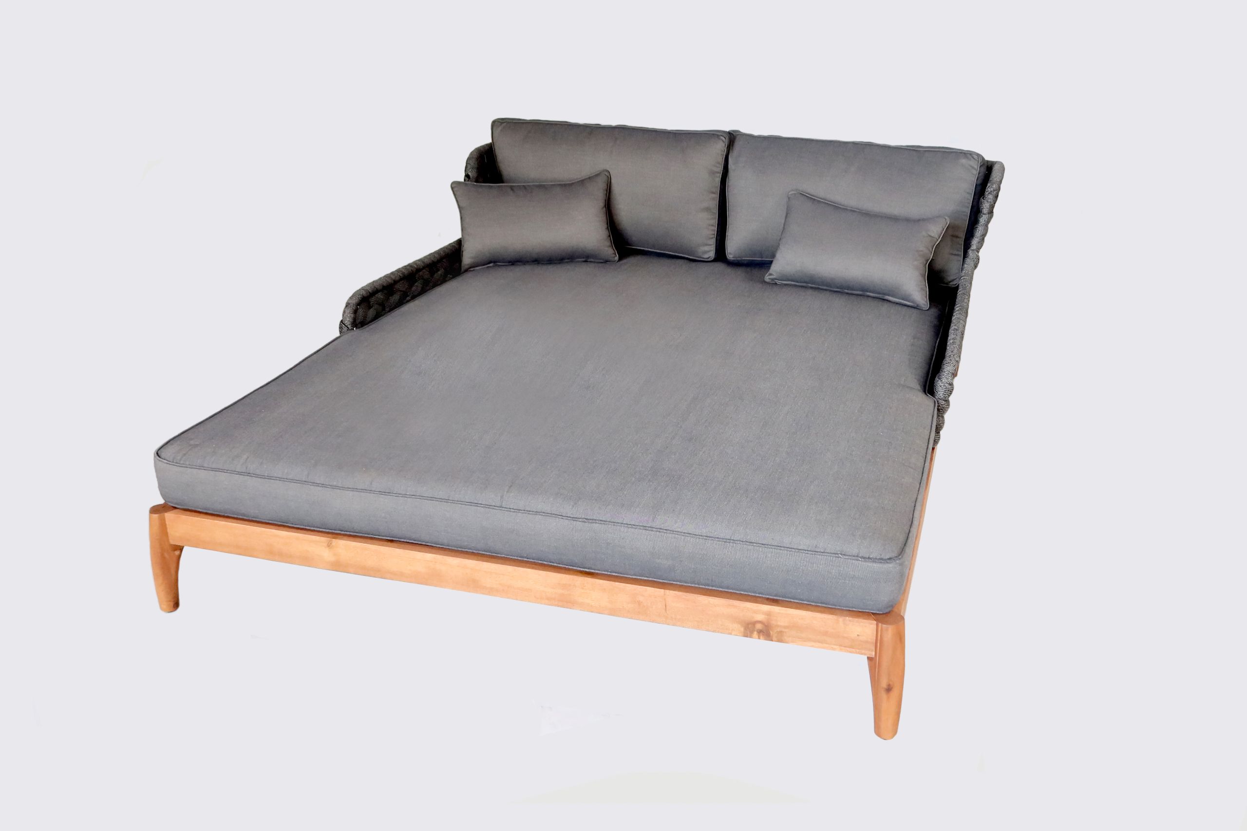 Akazienholz und strapazierfähiges Polyesterstrick. Sitz- und Rückenfläche ist bespannt mit horizontalen XL-Rope-Geflecht in modernster Kordeloptik. Inklusive bequemen Rückenkissen und Sitzpolster. Polster mit Reißverschluss und waschbar bis 30°.